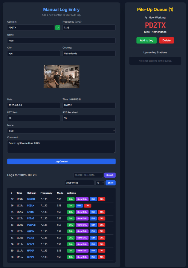 It includes a real-time queue to manage a "pile-up" (multiple stations trying to make contact). This allows the operator to see who is waiting and systematically work through the list, moving each callsign into the log form with one click.
